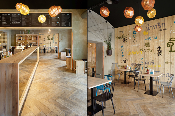 Оригинальные названия типичных ингредиентов азиатской кухни, исполненные в виде графических принтов на дощатых панелях, украшают стену в одной из посадочных зон. Чёрный потолок помогают сфокусировать внимание посетителей на объектах, находящихся на уровне глаз, в то время как его красивые волнообразные изгибы добавляют глубину и динамику в пространство.