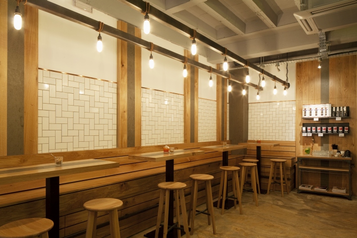 Много стекла и света, вот принцип интерьера кофейни, и ярко-зелёное название над зоной бариста придаёт лаймовый цветовой акцент всему помещению. Хромированные массивные детали лишь подчёркивают одновременную простоту и лоск заведения.